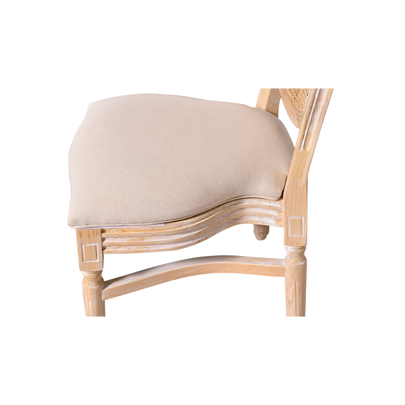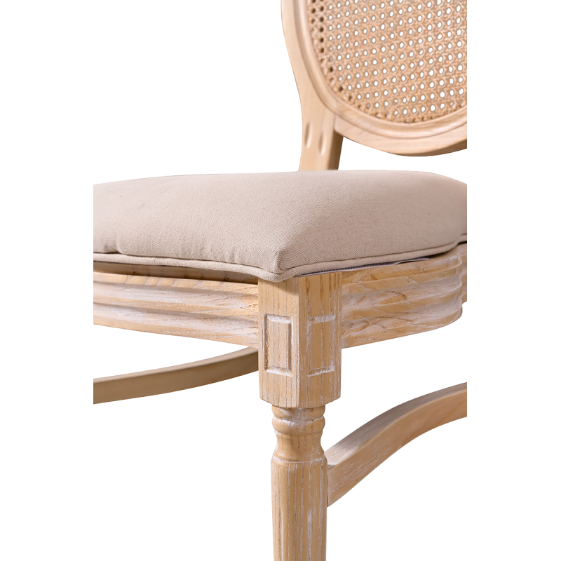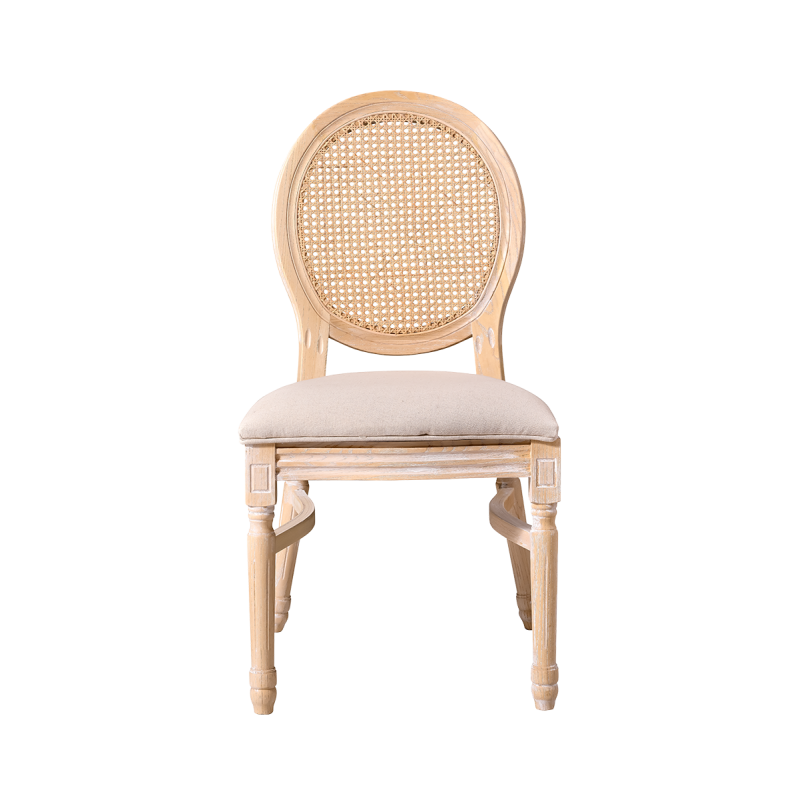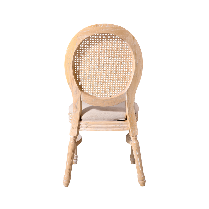 Pagaminta iš masyvios medienos, ši kėdė užtikrina stabilumą ir ilgaamžiškumą, reikalingą intensyviai naudojant komercinėse erdvėse. Rotango atlošas subtiliai praskaidrina klasikinę formą, suteikdamas jai lengvumo ir rafinuotumo. Paminkštinta sėdynė garantuoja patogumą net per ilgas šventes ir pokylius.