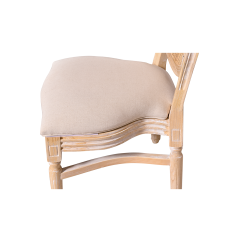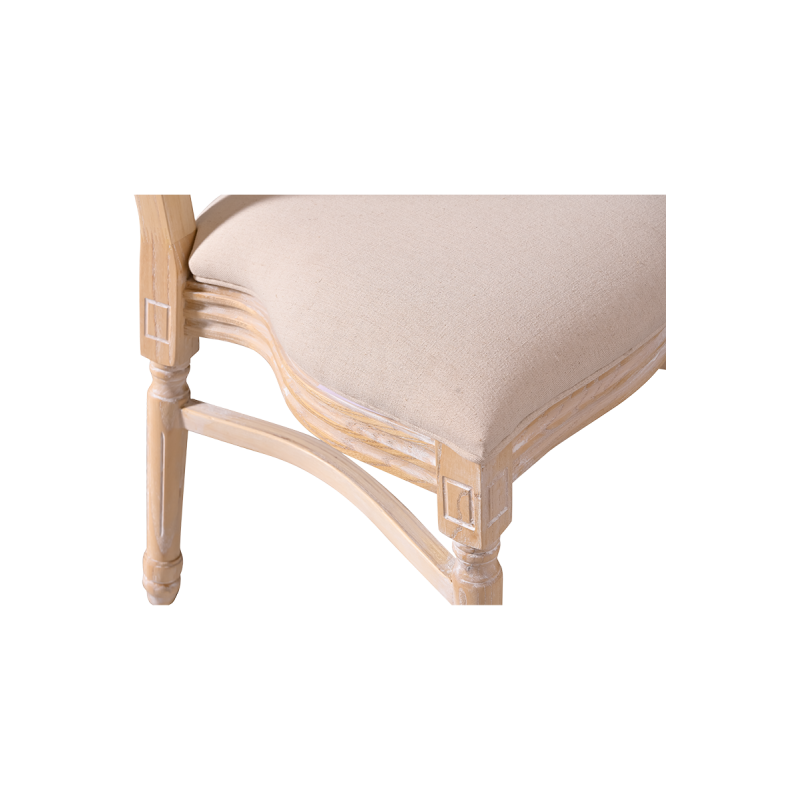 Švelniai suapvalintas atlošas su būdinga medaliono forma, drožinėtos kojelės ir subtilūs rėmo puošybos elementai pabrėžia jos elegantišką charakterį. Kiekviena detalė apgalvota su ypatingu dėmesiu estetikai, todėl ši kėdė ne tik žavi savo išvaizda, bet ir tampa dekoratyviniu akcentu, idealiu vestuvinėms fotosesijoms ir išskirtiniams salių interjerams.