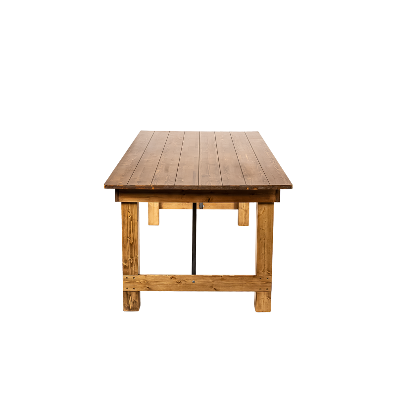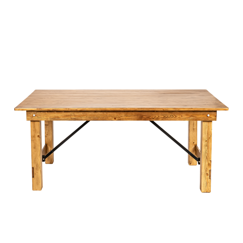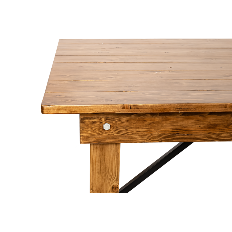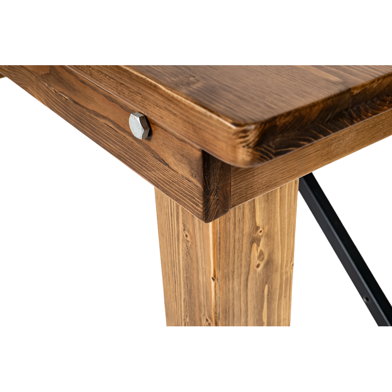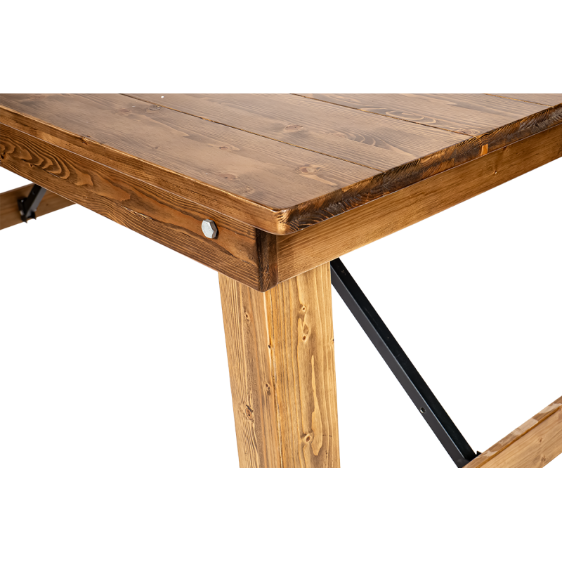 Natūrali pušies struktūra pabrėžia unikalų stalo žavesį, suteikdama patalpai šilumos ir jaukumo. Kruopščiai apdirbtos detalės ir matoma medžio tekstūra suteikia jam autentišką, kaimišką išvaizdą. Metaliniai sutvirtinimai padidina konstrukcijos stabilumą ir užtikrina saugų naudojimą net didelių renginių metu.