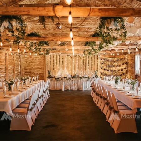 SLIMTEX HIT užvalkalas pagamintas iš lankstaus baltos arba juodos spalvos audinio. Vienas iš neabejotinų jos privalumų – nereikalauja lyginimo, o tai leidžia sutaupyti laiko, o tai labai svarbu organizuojant vakarėlį. Banketinės kėdės su uždangalu kiekvienam kambariui suteikia elegantišką, šiuolaikišką išvaizdą. Užvalkalus siuvame savo siuvykloje, pasirūpindami visomis detalėmis, kas garantuoja aukštą gaminio kokybę.